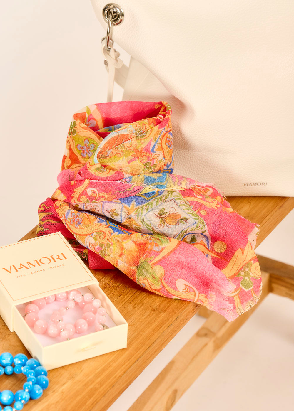 Das lebendige Muster des VIAMORI Tuchs erinnert an sonnige Tage in Italien und bringt die italienische Lebensfreude in deinen Look.